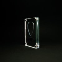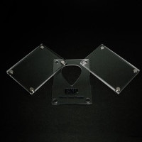 本体は3層構造で、表と裏には耐久性のある透明度の高いアクリルを使用し、ピックを嵌める中央層には曲げ強度の高いポリカーボネートを使用しています。トータルでの厚さが9.5mmあり自立が可能です。