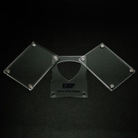 本体は3層構造で、表と裏には耐久性のある透明度の高いアクリルを使用し、ピックを嵌める中央層には曲げ強度の高いポリカーボネートを使用しています。トータルでの厚さが9.5mmあり自立が可能です。